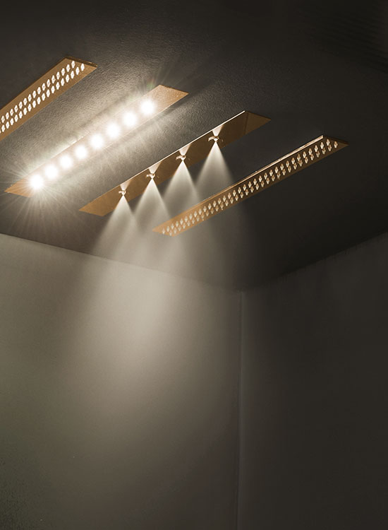 Cette simple bande de douche de 500 mm x 50 mm comprend quatre nébuliseurs d'eau pour créer une douche brumisateur. Adaptée au montage au plafond ou au mur, cette douche dorée exclusive est conçue avec précision en acier inoxydable de haute qualité et dispose d'une installation simple par clip à ressort. Créez une douche multifonctionnelle en ajoutant la douche à effet de pluie Line et la bande lumineuse de chromothérapie dans une finition dorée assortie.