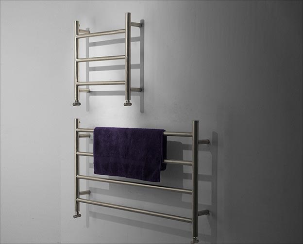 Ce magnifique sèche-serviettes chauffant moderne présente une finition nickel brossé superbe, idéale pour les salles de bains contemporaines. Disponible en cinq tailles différentes et trois formats de chauffage, ce radiateur de luxe en nickel est à la fois élégant et pratique.